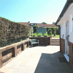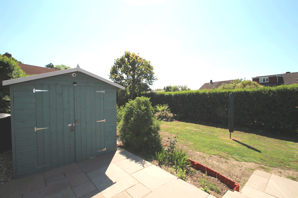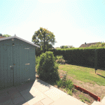 Rear garden laid to lawn with a shed and beautiful patio areas